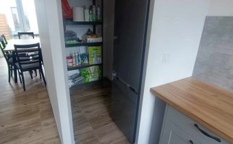 Kuchnia umeblowana szafkami i wyposażona we wszystkie sprzęty AGD (zmywarka, piekarnik, kuchenka, lodówka).