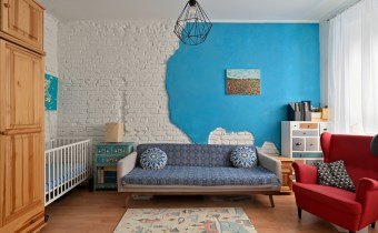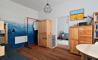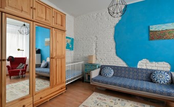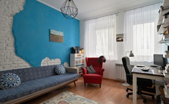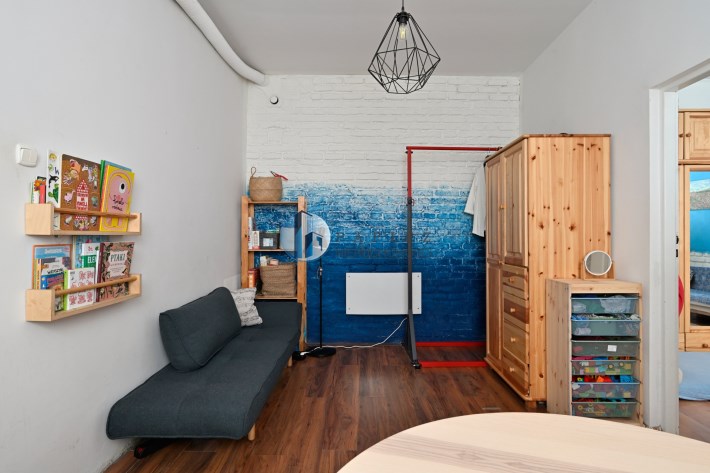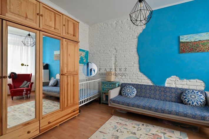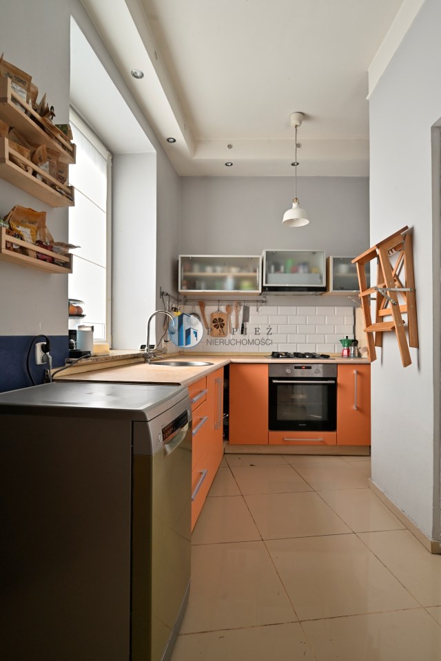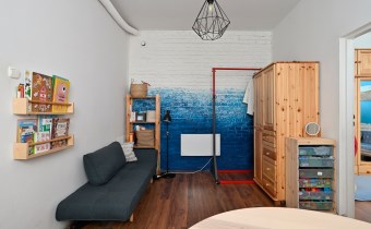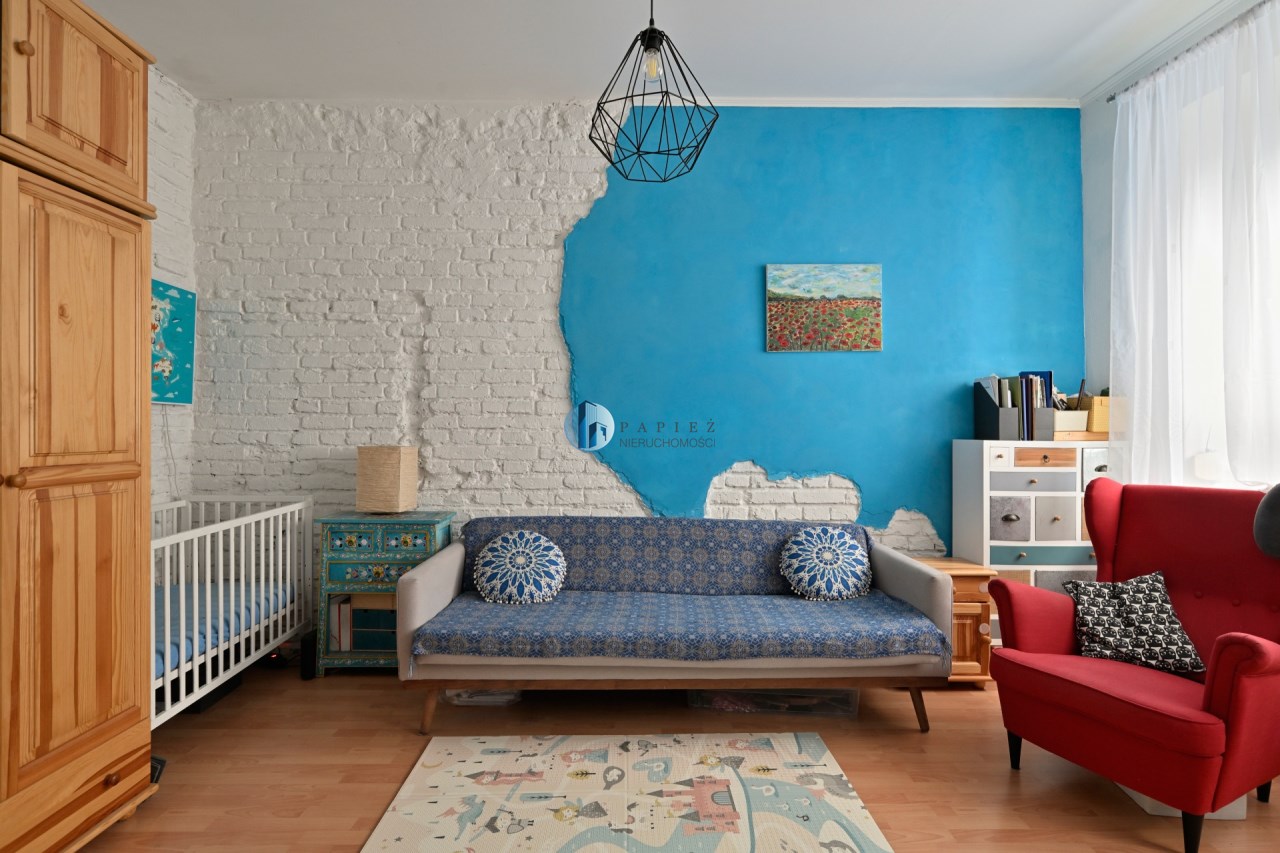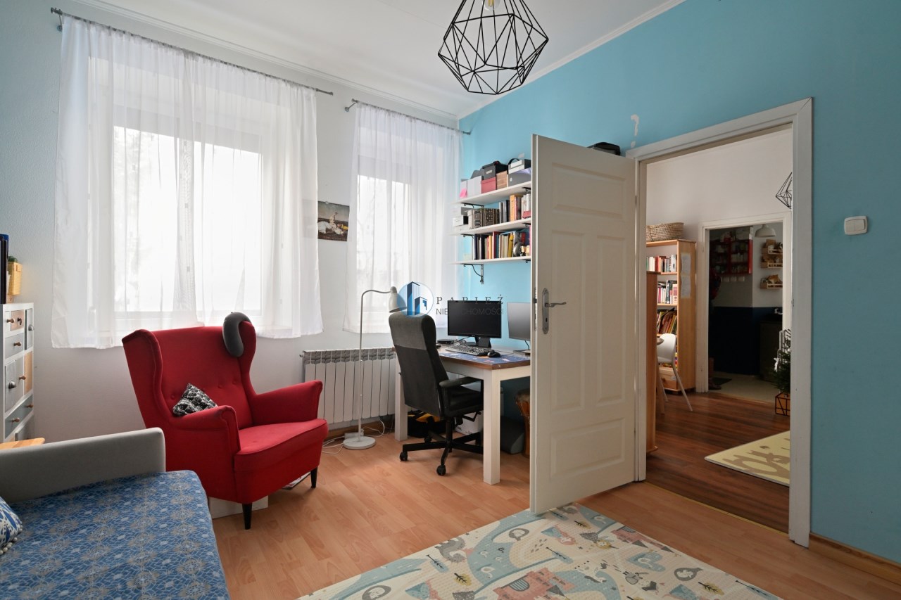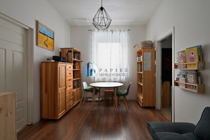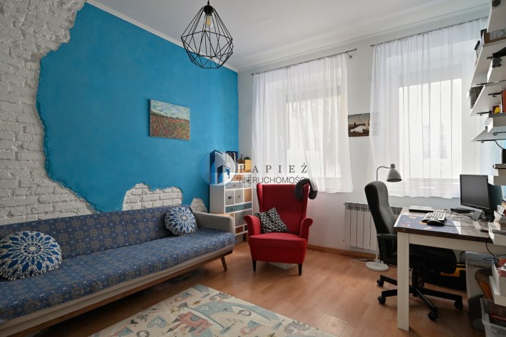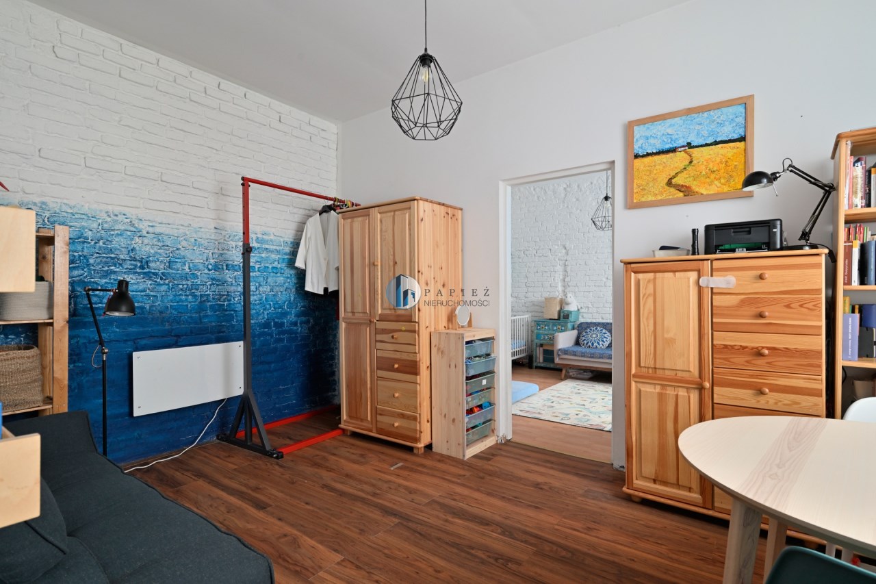 Mniejszy pokój pełni funkcję salonu i jadalni, z przejściem do ustawnej sypialni z dwoma oknami i miejscem na domowe biuro. Klimat kamienicy: grube mury, częściowo odsłonięta oryginalna cegła, duże okna i wysokość pomieszczeń ok. 3 m.