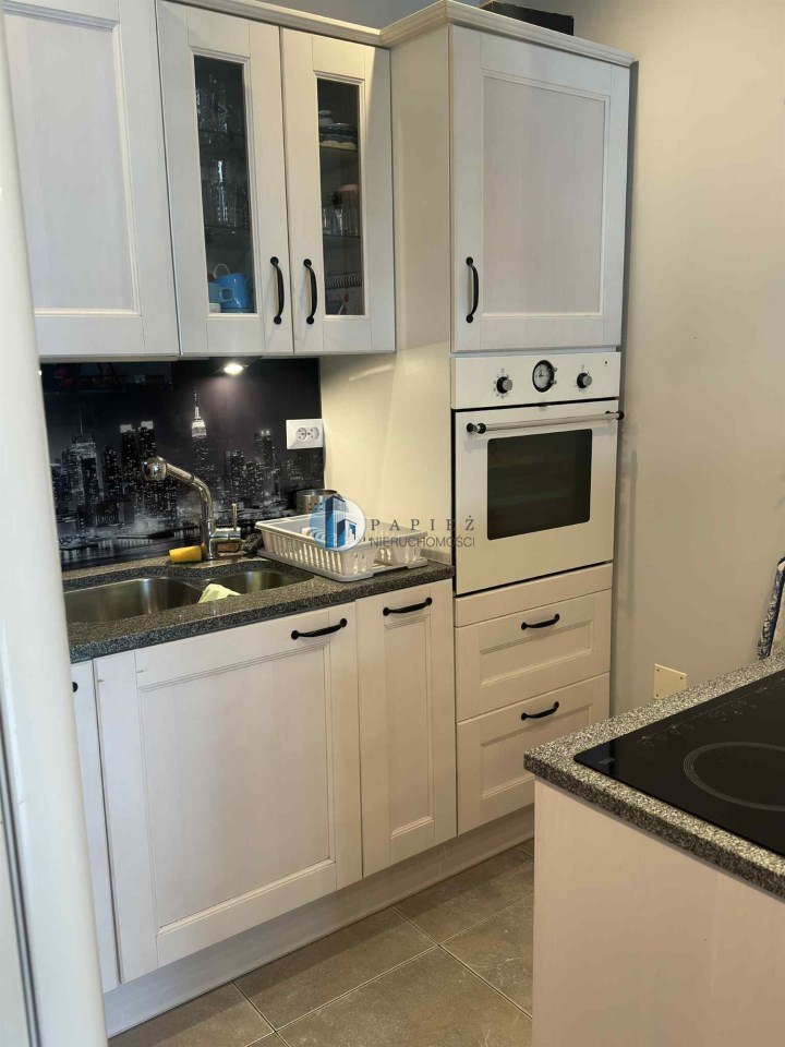 Zabudowa kuchenna ze sprzętem AGD, granitowy blat w kuchni.